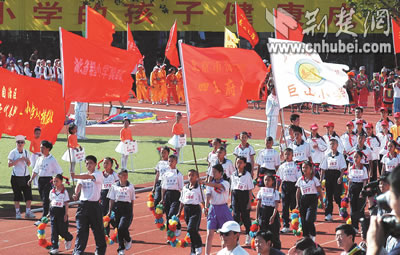 全國首屆希望小學(xué)運(yùn)動(dòng)會昨日在北京開幕,來自大別山下英山縣石頭嘴鎮(zhèn)希望小學(xué)的20名學(xué)生代表,向首都觀眾展現(xiàn)了湖北少年勤奮好學(xué),勇于拼搏的形象。據(jù)了解,中國青少年發(fā)展基金會發(fā)起實(shí)施希望工程15年來,已資助250多萬名農(nóng)村貧困學(xué)子,援建希望小學(xué)萬余所。湖北日報(bào)記者 王威 攝