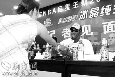 七分鐘后,前NBA巨星羅德曼出現(xiàn)在人們的視野里。他顯得有些疲倦,白色球帽遮住了那大半個五顏六色的后腦勺,不過那張有些冷酷的臉,還是讓人很快認出,這就是那個我行我素的“大蟲”羅德曼。