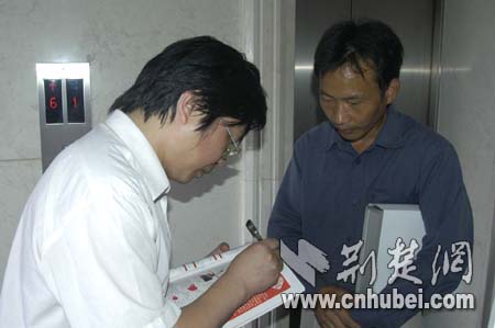 荊楚網(wǎng)副總編輯黃斌應(yīng)潛江萬(wàn)先生之請(qǐng)簽名留戀,萬(wàn)先生表示要將這份紀(jì)念帶回去