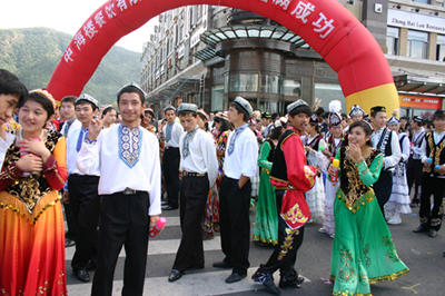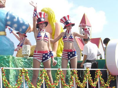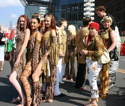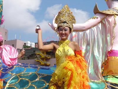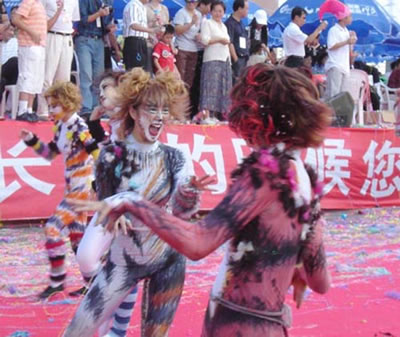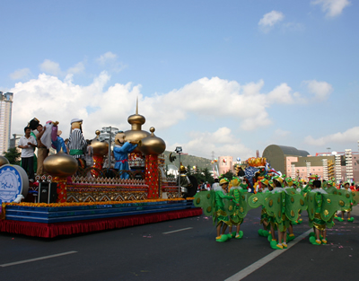 今天上午在新海廣場(chǎng)舉行的第六屆大連狂歡節(jié),更是使歡樂(lè)的海洋里掀起了歡樂(lè)的海潮。來(lái)自國(guó)內(nèi)外的24支狂歡巡游隊(duì)伍,以花團(tuán)錦簇的民族服裝和極度夸張的藝術(shù)手法,演繹了航天、花神、特洛伊木馬、梁山伯與祝英臺(tái)、孔雀仙子、海底動(dòng)物、蝴蝶服飾、阿凡提、醉酒、美人魚(yú)、回娘家、貓友、豪華游覽馬車(chē)、日月潭傳說(shuō)、堂吉訶德、木偶奇遇、狐假虎威、寶蓮燈、海娃與王子、小櫻丸子、尼爾斯騎鵝記、阿里巴巴、輪滑表演等國(guó)內(nèi)外著名童話(huà),電影故事等。最為耀眼的是以音樂(lè)劇《貓》的扮相出場(chǎng)的表演隊(duì)伍,他們獨(dú)特的表演和造型贏得了在場(chǎng)觀眾最多的歡呼聲?駳g的服裝藝術(shù)巡游,吸引了數(shù)萬(wàn)國(guó)內(nèi)外游客和當(dāng)?shù)孛癖姷挠^賞。