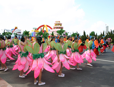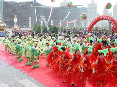 在遍布大連城100多個(gè)廣場(chǎng)上,形式多樣的民間文體活動(dòng),與狂歡節(jié)巡游隊(duì)伍遙相呼應(yīng)。