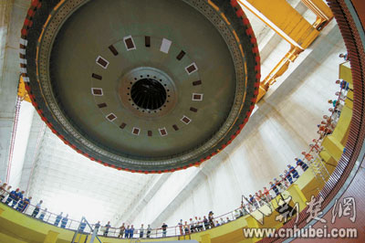今年8月1日,三峽左岸電廠的最后一臺(tái)發(fā)電機(jī)組轉(zhuǎn)子吊入機(jī)坑(圖二)。令三峽建設(shè)者們感到自豪的是,這同樣是世界上最大的發(fā)電機(jī)組,不同的是其零部件國產(chǎn)化程度達(dá)到85%。
