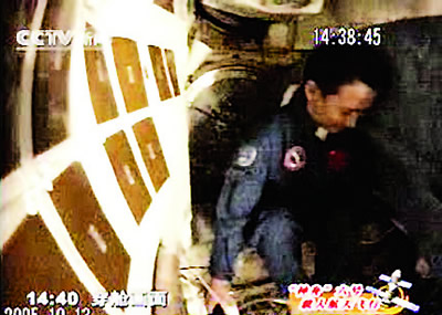 聶海勝正在進行“穿艙”———從返回艙進入軌道艙。