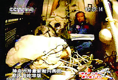 航天員在飛船內吃早飯