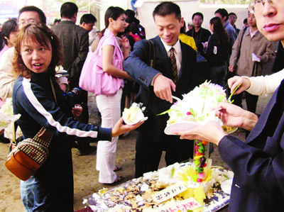 這個匠心獨運的蛋糕由妞妞公司制作贈送。其主體部分是一條飛龍,并書有“飛龍在天”字樣。飛龍一側,則是一只“神舟六號”航天飛船模型。