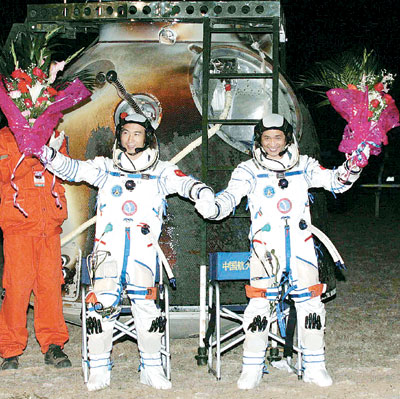 費(fèi)俊龍、聶海勝隔著舷窗,在向人們招手———返回艙內(nèi)柔和的燈光,映著他們的微笑。這一刻,距他們離開(kāi)大地4天又19個(gè)多小時(shí),他們的總行程為325萬(wàn)余公里。