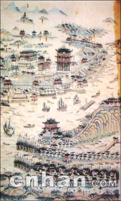此圖藏于大連市圖書館,手繪彩圖。未標(biāo)明作者姓名和成圖時間,圖中標(biāo)注了武昌、漢口“龍王廟”等。筆者鑒定此圖為清代中期作品,根據(jù)是圖中有“龍王廟”,而龍王齋建于乾隆四年(1739年),故此圖當(dāng)于1739年以后所繪。但圖中沒有出現(xiàn)漢口城堡,而漢口城堡建于1864年,同時圖中只繪有木帆船,而未出現(xiàn)現(xiàn)近代輪船。武漢江面出現(xiàn)航運和輪船是1862年以后。可知,此圖當(dāng)成于1862年前。可大體界定此圖繪于1739年至1862年之間。