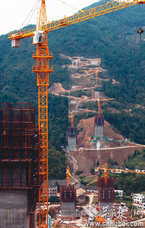 龍?zhí)逗犹卮髽蚓o鄰長(zhǎng)陽(yáng)縣榔坪鎮(zhèn),是滬蓉西高速公路上一座T構(gòu)箱梁橋,主橋墩最高178米,居世界同類橋高墩之最!耙娺^這么高的塔吊沒?”戴上安全帽,湖北路橋公司項(xiàng)目經(jīng)理夏君華帶記者一行踏訪工地。