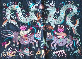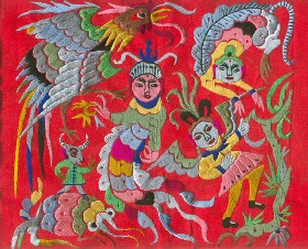 苗繡 刺繡,是苗族婦女盛裝不可或缺的飾物,主要有領(lǐng)花、肩花、襟花、背塊花、袖口花、裙鑲花、帽頂花、帽頂花等品種。苗族刺繡,整體上多為幾何構(gòu)圖,古樸多姿。其圖案因繡片條、塊的不同,分為幾何二方連續(xù)式和四方連續(xù)式構(gòu)圖。其圖案取材于生活中常見的草木、鳥獸、蟲魚、器具等。圖案的整體布局一般以菱形為立體紋樣,常見的是大菱形中套小菱形,小菱形又分別由不同色彩的方、圓、三角點(diǎn)狀組成。條狀繡片,多用點(diǎn)、線或線面組合,一整二剖構(gòu)圖。繡片是按布的經(jīng)緯戳針,故曲線多折角。大塊繡片,如背塊花等,多用菱形四方連續(xù)構(gòu)圖,并在其中布以對(duì)稱的變形幾何點(diǎn)及其他折線。所有繡片,粗看五彩斑斕,細(xì)觀則不同色線組圖分明,交錯(cuò)重疊,既復(fù)雜多變又結(jié)構(gòu)嚴(yán)謹(jǐn)、條理清晰。繡法很多,有平繡、凸繡、辮繡、堆花、縐繡、纏繡、挑繡、抽花等。平繡是最曾遍的繡法。這種繡法是重于圖案布局的美觀勻稱,色調(diào)鮮明,有明顯的物象感。凸繡流行于凱里、臺(tái)江部分地區(qū),它是在底布上多鋪幾層紙花,使所繡圖案凸出,有立體感。辮繡只在雷公山巴拉河一帶流行,其方法是將若干根色線編成辮子,按設(shè)計(jì)圖案平鋪于底布上,用絲線釘牢即成。圖案色調(diào)大致是青年女子鮮艷,中年以上婦女稍渾暗。如凱里、黃平、施秉等地,姑娘及較年輕婦女的盛裝刺繡以青布作底,繡大紅,間有少量白黃綠之色,亮麗醒目;中年以上婦女盛裝刺繡,亦以青布作底,以紫藍(lán)為基調(diào),間以少許桔紅、綠、白等色,顯得深沉穩(wěn)重。 京繡 京繡又稱宮繡,明清時(shí)期開始大為興盛,多用于宮廷裝飾、服飾,用料講究、技術(shù)精湛、格調(diào)風(fēng)雅,民間高檔的宮繡大都與皇宮有著千絲萬(wàn)縷的聯(lián)系。京繡屬手工刺繡,所以在今天機(jī)繡發(fā)達(dá)的時(shí)候,為區(qū)別于機(jī)繡又名“手繡”。京繡在解放后,逐漸形成了自己鮮明的藝術(shù)特點(diǎn)與風(fēng)格,其選料精當(dāng)貴重,針工巧妙得體,色彩絢麗豪華,格調(diào)高雅。其中最好為針工中的“平金打籽”繡。這種繡,是以真金捻線盤成圖案,或結(jié)籽于其上,十分精致,華貴。 發(fā)繡 發(fā)繡,又稱“墨繡”。是以人的頭發(fā)為材料,在綢緞、絲絹或滌綸布上精心繡制的特種藝術(shù)品。具有淡雅、不褪色、耐腐蝕、利于收藏等特點(diǎn)。彩色發(fā)繡是相對(duì)于單色發(fā)繡而言,它是指以不同人種的天然色澤發(fā)絲為材料,遵循色彩規(guī)律,在繃平整的布帛上施針度線,塑造形象的藝術(shù)。作品的質(zhì)感效果特別好, 畫面有微妙的色彩變化,層次較單色發(fā)繡豐富,技巧靈活多變,形象更加栩栩如生。 材料的特質(zhì)屬性賦予發(fā)繡藝術(shù)獨(dú)特的魅力,具有豐富的人文內(nèi)涵,如用自己的頭發(fā)繡一幅寫真“二我”,具有生命的直接紀(jì)念意義。作品集繪畫與刺繡為一體,具有一定的美學(xué)價(jià)值和經(jīng)濟(jì)價(jià)值,又能經(jīng)久保存,千年不變,可謂收藏極品。 甌繡 由于溫州地處甌江之濱,故得名“甌繡”。400多年以前,浙江溫州地區(qū)已運(yùn)用刺繡美化服飾, 繡品技藝也達(dá)到相當(dāng)水平。據(jù)說(shuō)甌繡最早產(chǎn)生于民間婦女之手,那時(shí)的刺繡品種有衣服、小兒帽 圈、圍涎、錦肚、婦女鞋面、枕頭、荷包等。題材只有花鳥魚蟲之類。甌繡真正成為供欣賞的藝 術(shù)品只有60多年歷史。1922年前后,溫州刺繡藝人林森友在上海一家刺繡莊發(fā)現(xiàn)了湘繡畫片, 回來(lái)后開辦了“美艷”刺繡作坊,仿照湘繡畫片的技法,改進(jìn)甌繡生產(chǎn)。從此,溫州出現(xiàn)了甌繡畫片。