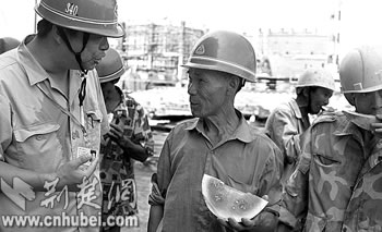 11日,武鋼修建公司工會為農民工送去西瓜和汽水。由于該公司工會堅持以人為本的管理思想,積極改善農民工工作環(huán)境,為他們配備了空調、冰柜和防暑降溫的冰飲、藥品,并在高溫期間實行錯時工作制等多項人性化管理辦法,大大地調動了農民工的積極性。