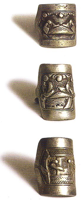 銀飾以白銀為原料,純度高,久用耐磨,不易腐蝕,光澤奪目,極顯高貴;一般為富裕人家的飾物,常有耳墜、戒指、手鐲、發(fā)簪、手鏈等。最為精彩的是帽飾人物,常用高浮雕、淺浮雕、鑲嵌和鏤空的表現(xiàn)手法,圖案多為龍鳳吉祥、長命富貴、麒麟送子等。